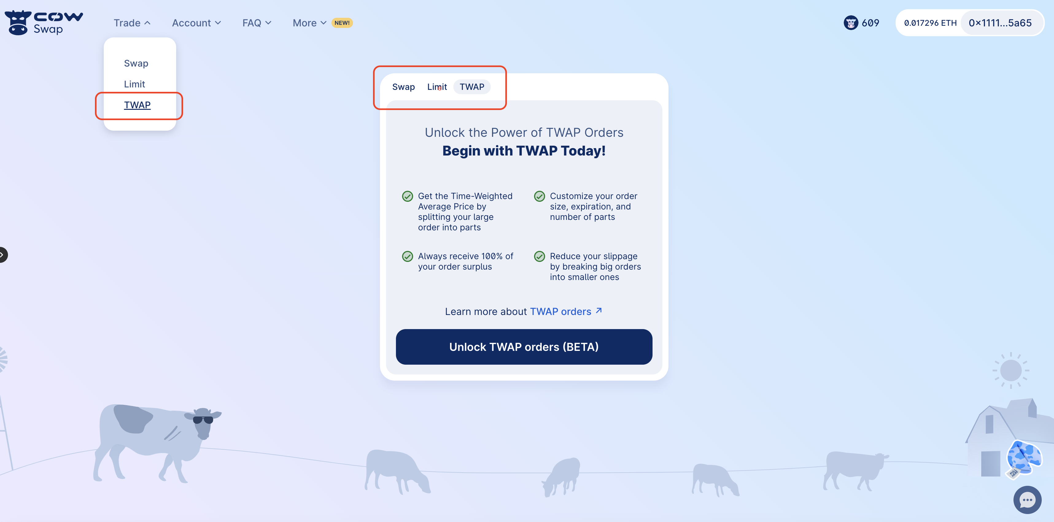 Once CoW Swap is loaded and connected to your Safe you can access TWAP orders via the "TWAP" tab near the center module or the drop-down menu next to the CoW Swap logo.