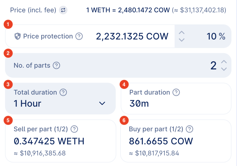 2. Number of Parts: Decide how many discrete parts you want to divide your order into. This choice will determine the granularity of your TWAP strategy. For example, if you choose to split your order into 2 parts and you are selling a total of 2 WETH, each part will involve selling 1 WETH. The parts have a minimum size of $5k on Mainnet or $5 on Gnosis Chain because each part will need to be executed on-chain, meaning there's a cost associated with each execution.